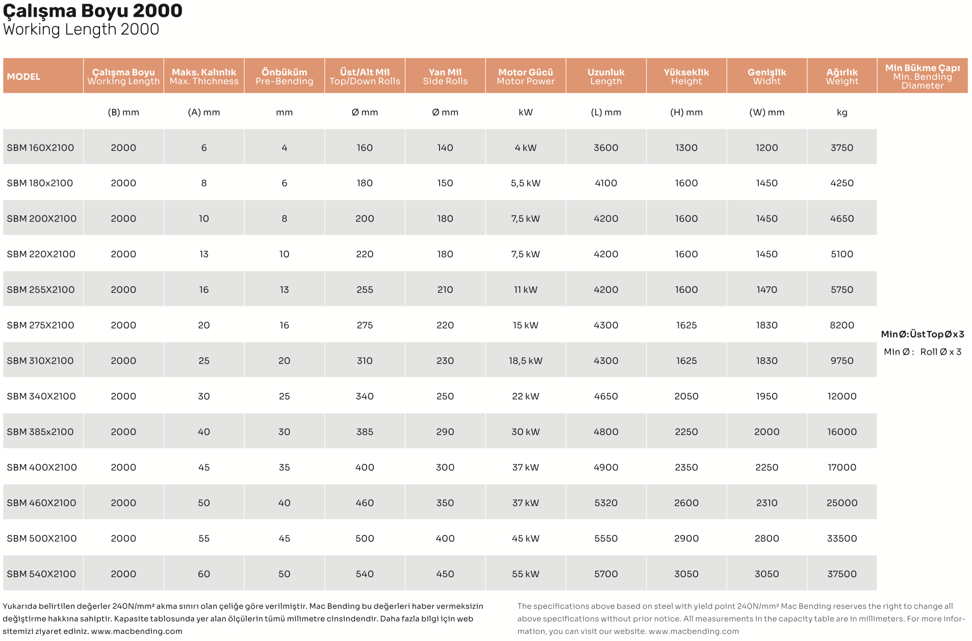 Çalışma boyu (mm) : 2000 Maksimum Kalınlık (mm) : 6 Ön Büküm (mm) : 4 Üst/Alt mil (Ømm) : 160 Yan mil (Ømm) : 140 Motor Gücü (kW) : 4 kW Uzunluk : 3600 Yükseklik : 1300 Genişlik : 1200 Ağırlık : 3750