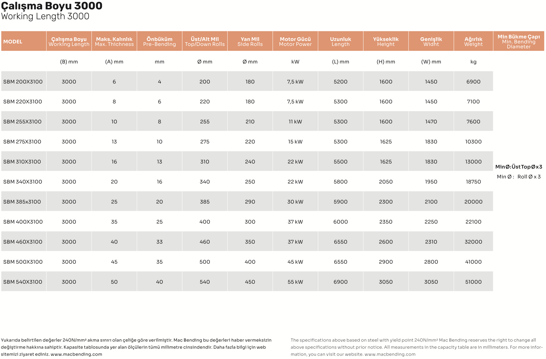 Çalışma boyu (mm) : 3000 Maksimum Kalınlık (mm) : 6 Ön Büküm (mm) : 4 Üst/Alt mil (Ømm) : 200 Yan mil (Ømm) : 180 Motor Gücü (kW) : 7,5 kW Uzunluk : 5200 Yükseklik : 1600 Genişlik : 1450 Ağırlık : 6900